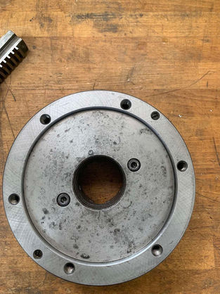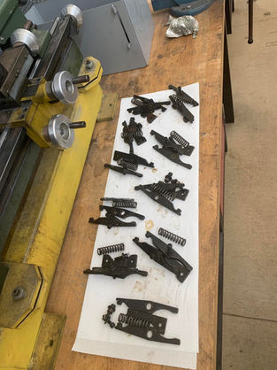 Disassembled, cleaned, and reassembled key components including the milling table, spindle, carousel-type tool changer (plate, springs, extractor forks, keys, bushings, washers, bolts), vise, chuck, and tool holders.